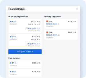 Manage all your financial interactions in one place. From payment requests and invoices to refunds and credit notes, you see everything organized by quotes or orders. Pay outstanding items directly and enjoy a simpler, more transparent way to handle your team’s finances.